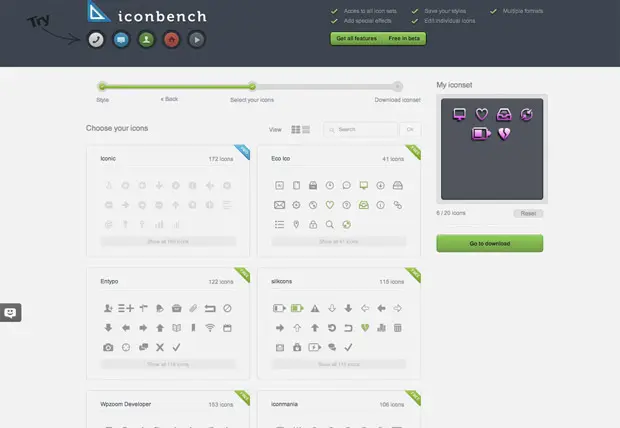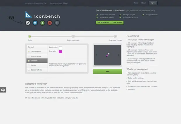 Iconbench是一个可以让设计师轻松完成各类风格的图标工具,最重要的当然是免费了,可以方便地选择多达20个图标风格来完成你的素材图标制作,可以添加各类特效和遮罩,完成的图标可以应用在WEB、手机端、苹果系统端。