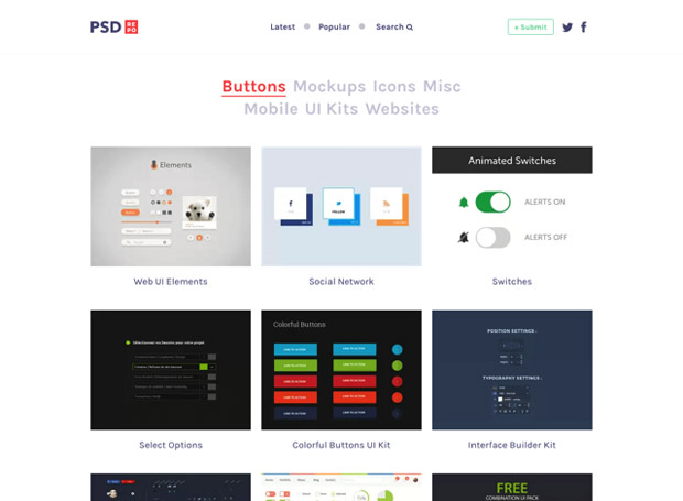 开启 PSD Repo 网站后,可以在首页找到许多近期加入的 PSD 档案,若你想找寻特定类型的设计,也可以利用上面的选单,例如点选 Buttons 可找到许多与按钮相关素材。
