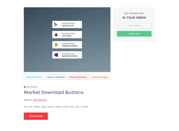 点选进入素材页面,下方就会有红色的「Download」下载链结,可直接取得该图形的所有 PSD 资源,通常在 PSD Repo 里也会一并提供相关链结(包括素材的原始来源页面等等),透过链结即可找到更多说明,包括授权方式。