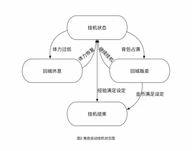 }通过图2我们可以看到,一共有四个状态: * 挂机:将角色移动到副本中,寻找附近的怪物击杀,获取经验和金钱,扣除体力。若经验到达设定值,则停止挂机。 * 回城休息:角色体力过低,自动移动位置到城里休息。休息完毕回到挂机状态。 * 回城贩卖:角色背包装满,回城自动贩卖,若金钱到达设定值,则停止挂机,否则回到挂机状态。 * 结束:挂机过程结束,角色回城。