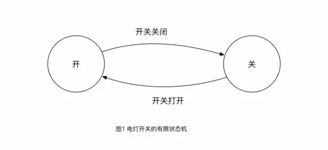 例如,灯的开关就是一个非常简单的有限状态机。它有两种状态:开或关。这两个状态的切换是通过手指的输入产生的。打开开关,产生从关到开的状态变换;关闭开关,产生从开到关的状态变换。