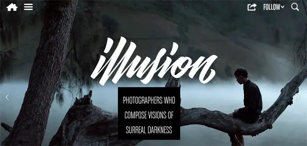 illusion:展示最惊人的创意图片 关关_关关 2016-01-05 625 阅读1分钟 原文链接: illusion.scene360.com illusion 幻觉:展示最惊人的创作,涵盖艺术、设计、摄影和视频,主要都是一些创意图片,每天汲取灵感。帮助艺术家、网页设计师、电影工作者寻找和发布他们的灵感创意。看它的中文名“幻觉”就知道了,不过我觉得一般人还真用不了。 官方网站:illusion.scene360.com/