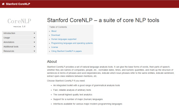 Stanford CoreNLP 提供了一系列自然语言的分析工具,对于用户提供的一段文字,无论是公司名,人名还是时间日期、数量,它都能提供出每个词语的组成与语法,并且用短语、词汇间的依赖关系来标记出语句的组成结构,比如那些名词指代同一个事物,比如根据上下文的描述来分析观点与开放式的事物关系等。