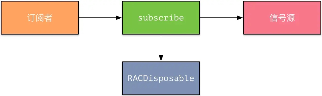 订阅者对信号源的一次订阅过程可以抽象为:通过 RACSignal 的 -subscribe: 方法传入一个订阅者,并最终返回一个 RACDisposable 对象的过程: