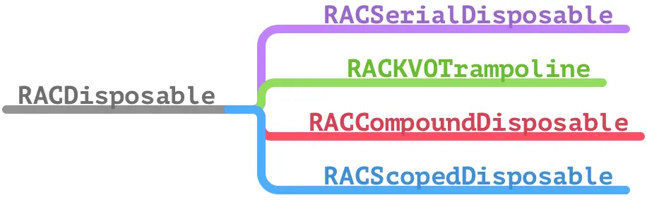 RACSerialDisposable:作为disposable的容器使用,可以包含一个disposable对象,并且允许将这个disposable对象通过原子操作交换出来;RACKVOTrampoline:代表一次KVO观察,并且可以用来停止观察;RACCompoundDisposable:跟RACSerialDisposable一样,RACCompoundDisposable也是作为disposable的容器使用。不同的是,它可以包含多个disposable对象,并且支持手动添加和移除disposable对象,有点类似于可变数组NSMutableArray。而当一个RACCompoundDisposable对象被disposed时,它会调用其所包含的所有disposable对象的-dispose方法,有点类似于autoreleasepool的作用;RACScopedDisposable:当它被dealloc的时候调用本身的-dispose方法。