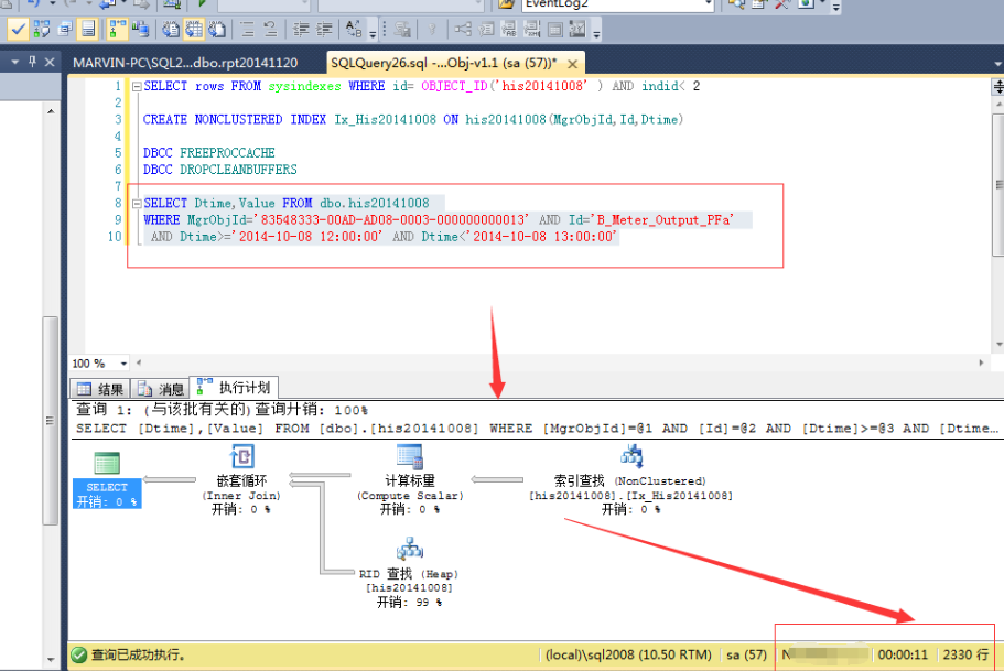 跟上述几点原则,我们建立以下的索引:CREATE NONCLUSTERED INDEX Idx_His20141008 ON dbo.his20141008(MgrObjId,Id) INCLUDE(Value,Dtime)