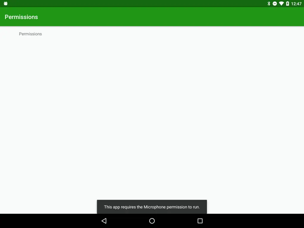The two permissions that we require actually fall in to two separate categories of permission: RECORD_AUDIO is considered a dangerous permission and MODIFY_AUDIO_SETTINGS is considered a normal permission. A dangerous permission is one which may compromise security or privacy; whereas a normal permission is for something which requires access to resources outside the apps’ domain, but has little or no risk to the users’ privacy. Normal permissions will be automatically granted by the system whereas dangerous permissions will require the user to explicitly grant that permission to your app at runtime.