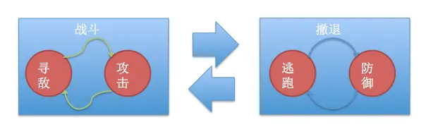 例如高级状态包括战斗、撤退,而战斗状态中又包括了寻敌、攻击等几个小状态;撤退状态中又包括了防御、逃跑这几个小状态。