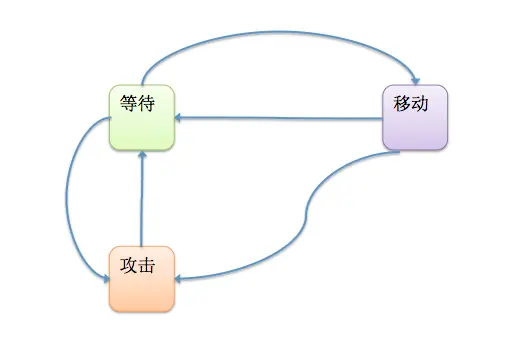 上图是一个具体的使用有限状态机实现游戏AI的场景,描述的是一个游戏单位的AI,下面我们就使用switch语句来实现图中的状态机。