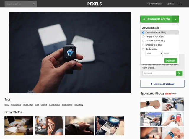 以其中一个图库网站为例,开启原始网页后,点选右上角的「Download For Free」即可下载、取得图片,比较特别的是这个网站上还把相片裁切为不同大小。