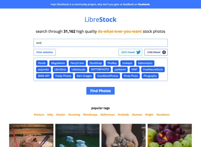 LibreStock 网站,能够一站搜寻二十个常用的图库网站,这些网站我们之前介绍过,但如果一站一站浏览可能不是那么方便,透过这项服务,只要输入要查找的相片关键词,即可在这些庞大的图库中大海捞针,找出你喜爱的免费相片素材。