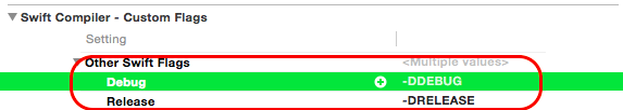 在 (Build Settings -> Swift Compiler - Custom Flags) 中加入 -DDEBUG,