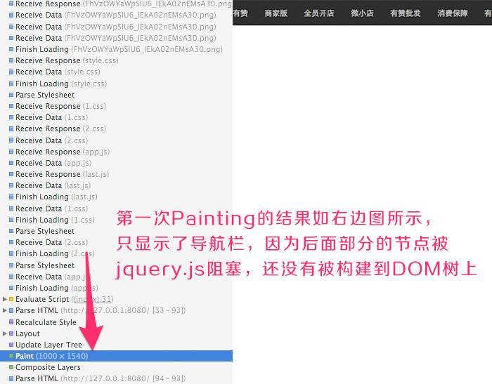 我扒了一段有赞PC首页的代码到本地,通过Node跑起来。Node作为Server端,对/js/jquery.js 做了延时2s返回的处理,并且把 放到导航栏的下面,结果是这样的: