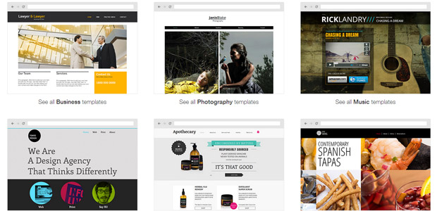 4. 上百个模板,分不同商业、服务、餐饮、住宿、音乐、娱乐、在线购物、零售、摄影、艺术、facebook等不同类别。