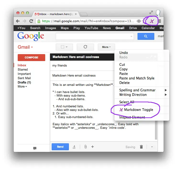 事实上,这个插件不仅仅是用来写邮件,只要是在Chrome下,在标准的Form Input元素中输入Markdown,你都可以用这个插件帮你做转换。