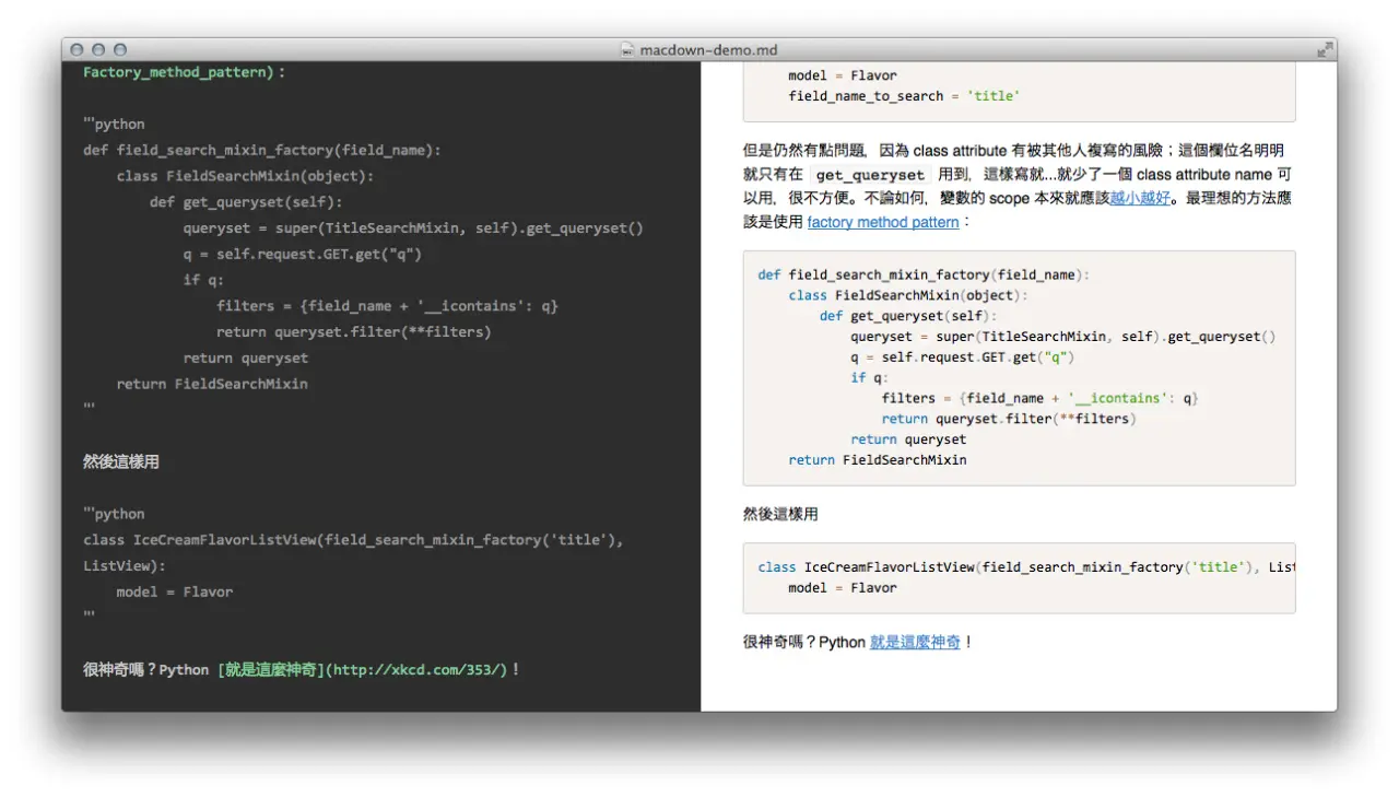 Mou的抄袭者,开源,大部分功能跟Mou雷同。我更喜欢它对fenced code block的语法高亮显示。这里有二者大致的对比。