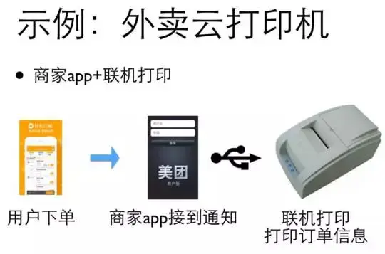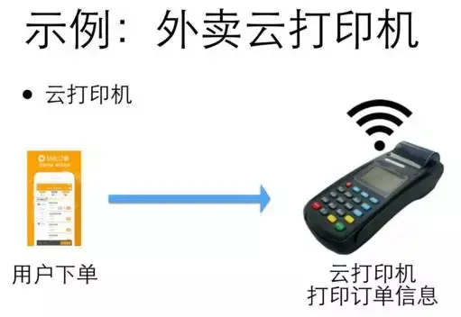 今年5月份的时候,我们的硬件的团队,他们就说我们自己来做一个云打印机。所谓云打印机就是它自己可以联网,联网的时候有很多联网的方式,比如说我可以插一个手机卡,通过手机的网络来联网,或者我也可以通过WiFi来联网,联网之后,手机下单的时候,我们的美团后台的服务器会把这个单子的信息直接推送到这个云打印机上,这个云打印机就像一个POS机那样,是一个很小的设备,会自动地打印出单子的信息,这样就大大得解放了我们美团的同学和商家的同学。这是一个我们用技术来优化商家端这边的流程的一个例子。