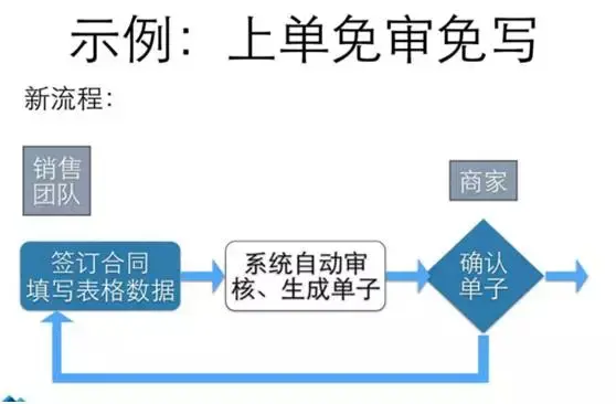 所以当我们做了这些努力之后,我们新的流程变成什么样子了呢?销售团队同样还是要去填合同,但是他填写一个表格的数据,填写好后这个表格的数据,系统会自动地审查,自动地生成一个单子,然后立刻可以给商家做确认,商家确认之后,就可以上线给用户了。然后,做了这些努力之后,我们把中间的很多环节和步骤,包括人力都省掉了,我们不需要那么多编辑的同学,不需要那么多审核的同学,而且整个的流程会走地非常顺畅,非常快,便捷。