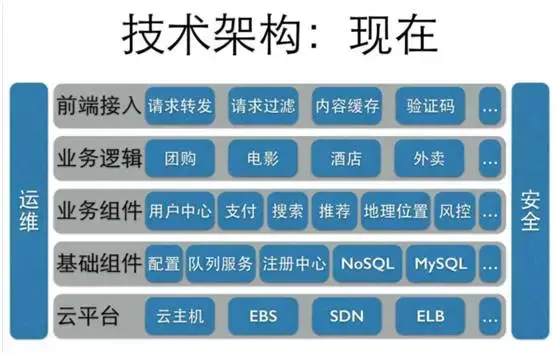 这个时候其实也就是简单地把LAMP架构做了一点点扩展,但是已经可以支撑很多很多的用户,很多很多的容量了。我们在这种架构的前提下发展,直到我们想去做新的业务。美团一开始起步是个团购公司,后来我们去做一些新的,比如说酒店业务、电影业务,直到现在大家可能使用过的美团外卖的业务。当我们去做很多不同的业务的时候,我们发现做每一个业务似乎需要添加一些新的部分,这样一个部分、一个部分堆积,对很多技术的同学来说,这是不能容忍的,那我们怎么去改进它呢?我们希望把中间的很多的公共的东西,与业务无关的东西抽取出来,形成一些公共的技术的组件,这样可以为很多的不同的业务来使用,发展到现在,形成这样一个看起来稍微复杂的架构。