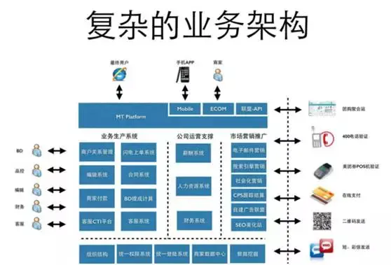 除此之外,还有整个公司的运营,一些市场的营销推广,我们怎么去拉动我们新的用户,怎么去拉动我们的新的商家等等,所以就涉及到很多的业务的模块。整个的这个框架,细节我们不关注,但是第一感觉肯定是非常复杂,这个复杂的业务架构有一个什么后果呢?一般来说,它会让整个流程非常复杂,当流程复杂了,那自然而然带来的整个效率低下,所以对于技术团队来说,我们一个努力就是在不断地去优化我们的业务架构,不断地让流程简单,让效率更高,那怎么来优化呢?