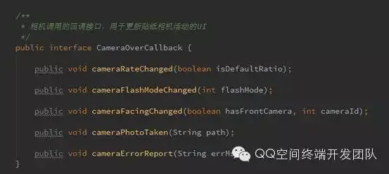 第三步:编写自定义相机Activity,主要是定制相机界面,实现UI交互逻辑,如按钮点击事件处理,icon资源切换,镜头尺寸切换动画等。这里需要声明一个SurfaceView对象来实时显示相机预览画面。通过SurfaceHolder及其Callback接口来一同管理屏幕surface和相机资源的连接,相机预览图像的显示/关闭。
