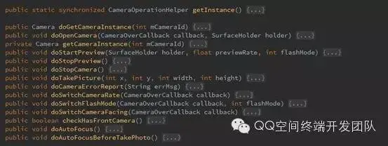 第二步:编写相机操作功能类CameraOperationHelper。采用单例模式来统一管理相机资源,封装相机API的直接调用,并提供用于跟自定义相机Activity做UI交互的回调接口,其功能函数如下,主要有创建\释放相机,连接\开始\关闭预览界面,拍照,自动对焦,切换前后摄像头,切换闪光灯模式等,具体实现可以参考官方API文档。