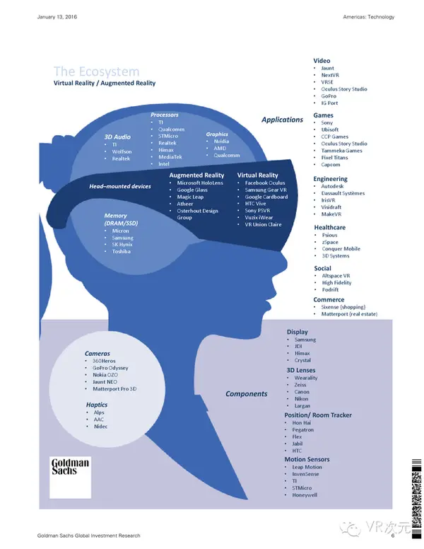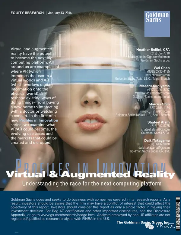 腾讯科技讯 高盛本月发布了《VR与AR:解读下一个通用计算平台》的行业报告。为此,腾讯科技将该报告做了汉化处理,供行业内人士参考(全文超过2.9万字,现压缩到1.9万字,关注微信公众号“VR次元”或搜索“qqtechvr”,回复“全文”,即可获得PDF版本报告全文)。