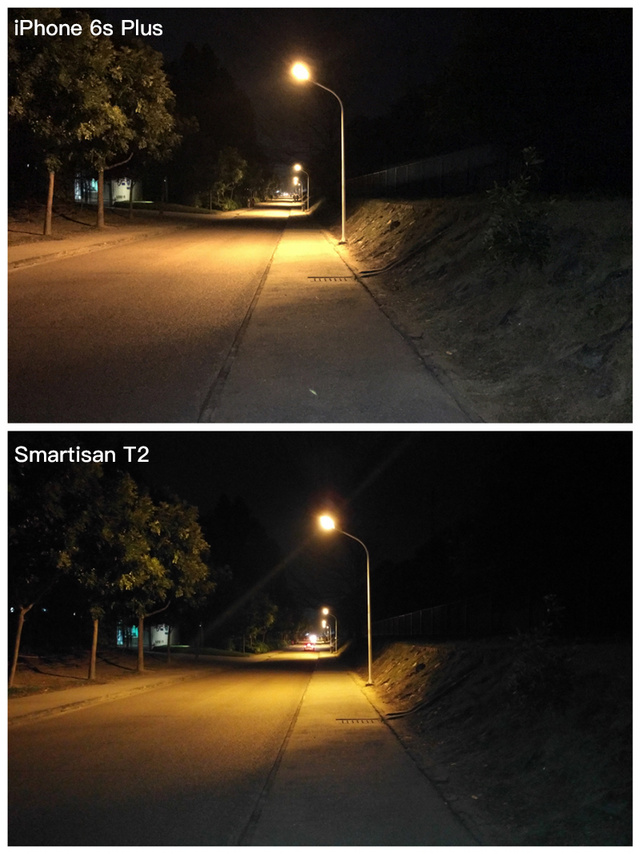 T2 在光学防抖的帮助下,夜间成像也处于国产第一梯队,和同样具有光学防抖的 iPhone6s Plus 相比,除了暗部涂抹稍微严重一点,整体表现还是非常不错的,当然 T2 在夜间拍摄时,取景框依然有着许多安卓机都存在的掉帧的老毛病。