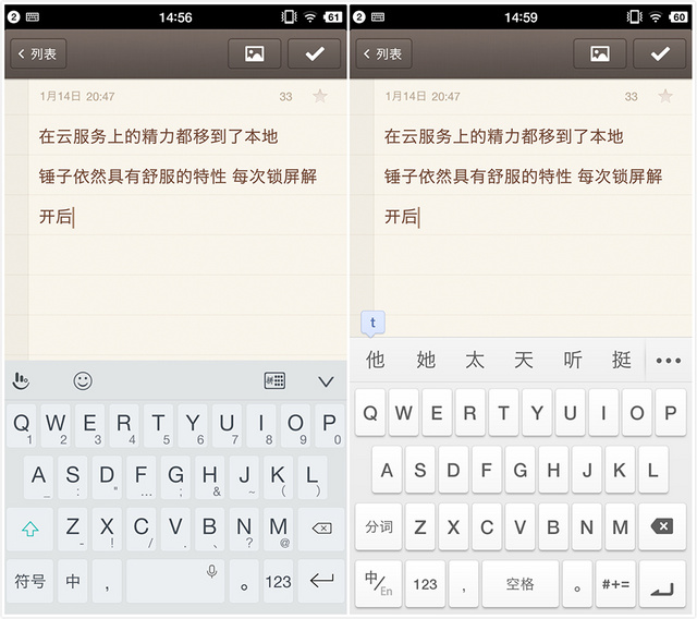 以最常用的输入法为例,目前绝大多数的输入法都开始往扁平化方向进行设计,同样是全键盘风格,锤子自带输入法的视觉表现就比第三方触宝输入法的表现要好的多,而需要双拼大词库等功能的我,又不得不为了更好的第三方功能而在视觉审美上做出妥协。