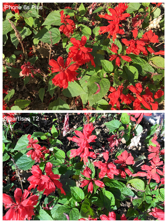 T2 的拍照素质表现有点超出我的预期,IMX214 这颗索尼 2014 发布的摄像头依然老当益壮,其性能从T2的表现上来看,已经被锤子的工程师门吃的很透了,抛开不支持相位对焦的硬伤,从观感上来说,T2 的表现比起其他刚入门手机的厂商要好的多,无论是色彩还原,噪点控制,画面纯净度等方面都有不错的表现,而主要的问题则在于白平衡有轻微的偏蓝,以及在拍摄部分颜色鲜艳的物体时,色彩饱和度有点过高,比如第二组中的红花,实际的颜色更偏向于 iPhone 的深红,而 T2 上已经表现的有些偏粉,T2绿叶的颜色也显得有些绿的发亮。