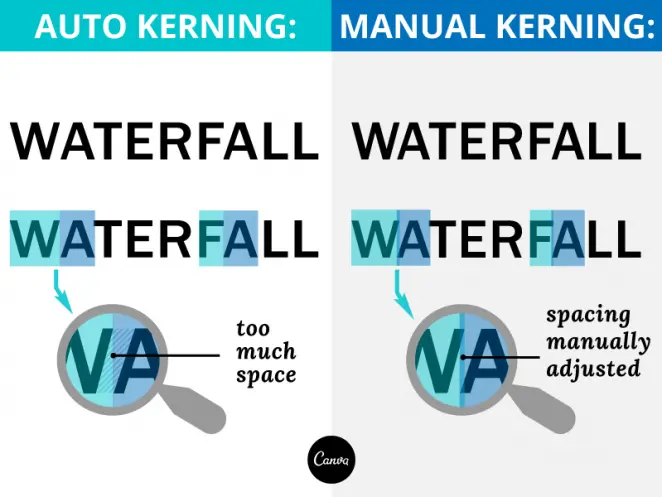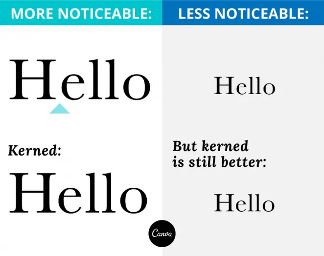 Sometimes a font’s default kerning isn’t ideal for certain letter combinations, so you’ll want to manually adjust it so the spacing between all the letters looks consistent. It’s important to note here that kerning is a visual exercise; it’s about the perceived amount of space between letters rather than the actual distance between them. Kerning involves adjusting your typography to look right rather than creating mathematically equal spacing.