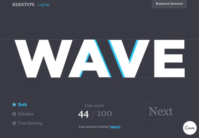 After you’re done, click “Compare” and then make sure to select the “Both” option so you can see your kerning work (in white) compared to the recommended solution (in blue). You get a score according to how close you came to the recommendation. Exercises like this one can help you get accustomed to the visual process of kerning.