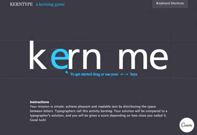 The game doesn’t have any instructions, so here’s how it works: You’re given a word to kern; the first and last letters are locked in place, and you’re supposed to move the remaining letters to create the appearance of equal spacing.