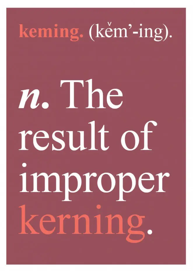 Text that is tightly spaced can be hard to read, especially at small sizes. Another negative side effect of under-kerning is that letters can be so close that they touch, which sometimes creates a whole other letter (or word!). This witty poster demonstrates that possibility: What happens when the “r” and “n” in “kerning” are spaced too closely? They become an “m” (and create a new term to add to your typographic glossary):