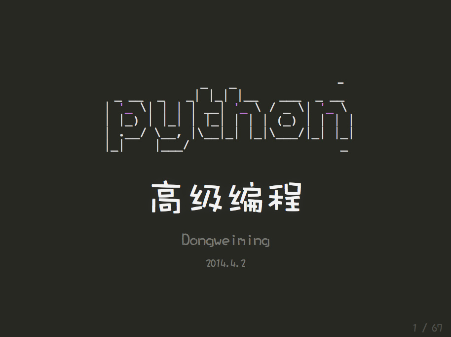 我以前在学习python模块的时候,曾经翻译pymotw的文章,其实还是有抄袭的嫌疑,从最近开始逐渐直接阅读python标准库源码, 收获颇多. 我现在不愿意教一些从网上或者书里提到的知识点,而更愿意根据我工作中常见的需求去挖掘对应的python的解法.也是在过程中对一些东西有了比较深的理解. 这个ppt是从像黑客一样使用 Linux 命令行获得的灵感. 然后角度为, 还用到了webfonts娃娃体^.^