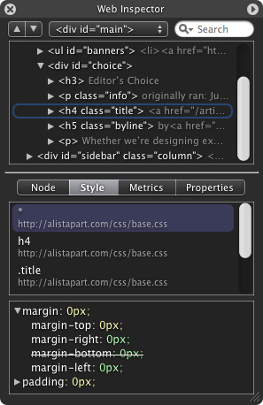 第一个可以用来查看实际 DOM 层次的版本,在一个紧凑的 HUD 窗口中。选择 DOM,可以看到与之匹配的所有 CSS 规则,并在页面中将这个 DOM 高亮。