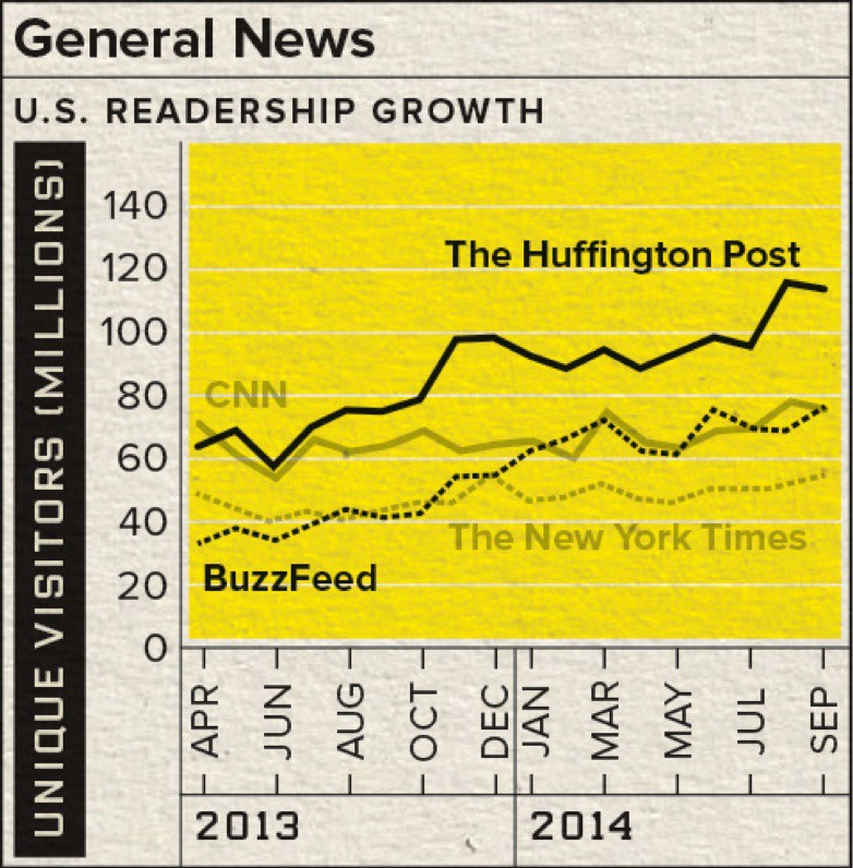 最后,ComScore 的数据是否包含应用的访问量,这一点尚不清楚。我知道他们在一定范围内跟踪记录应用的使用量,但他们在上表中是否计算了所有《纽约时报》的应用(或者 BuzzFeed 的应用)呢?(如果您知道的话请留言)