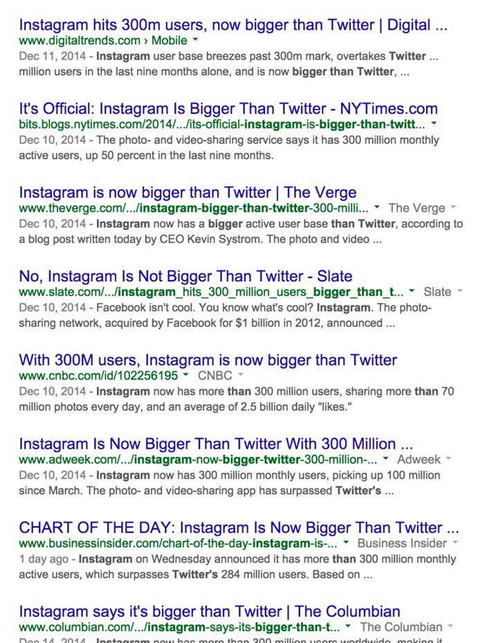 以最近的 Instagram/Twitter 对比为例,我看到 Will Oremus在 Slate 上的文章里就没有再滥用 “更大”这个标题。他很好地解释了为何事情没这么简单。这是一篇很值得读的文章,其中心意思如下: