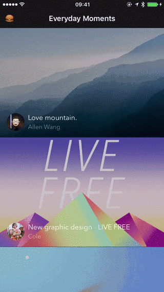 1) 照片横屏划动的旋转木马效果,用 UICollectionViewDataSource 来实现的,每一个卡片是一个 CollectionViewCell;