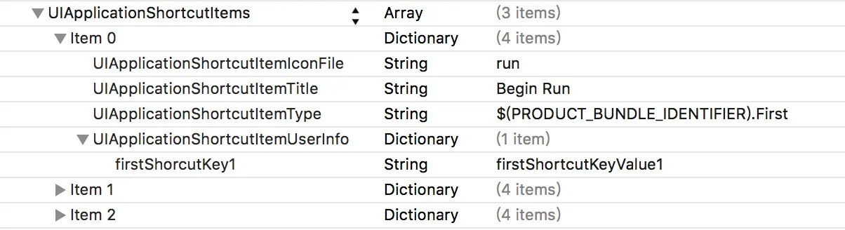 1)3D Touch 快捷方式是一开始需要在info.plist 里配置 UIApplicationShortcutItems,如下图,我分别配置了我最想要的3个快捷方式,在设置 App 里切换 WiFI,在 NikePlus 里快速开始跑步,照相机里扫描二维码;