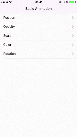 1)今天返回学一下动画最基础东西,分别是 Position, Opacity, Scale, Color, Rotation,不管是多酷炫多复杂的动画都是这些基础的累加,本示例里的动画都写在 viewDidAppear() 里;