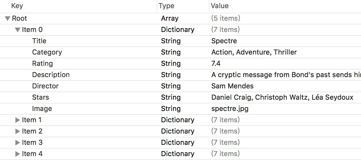 1)iOS 8 之后即可支持在 iOS Spotlight 里搜索第三方应用的数据了,为了做到你的 App 内的数据是 searchable 的,要先新建一个 MoviesData.plist 里配置下数据属性;