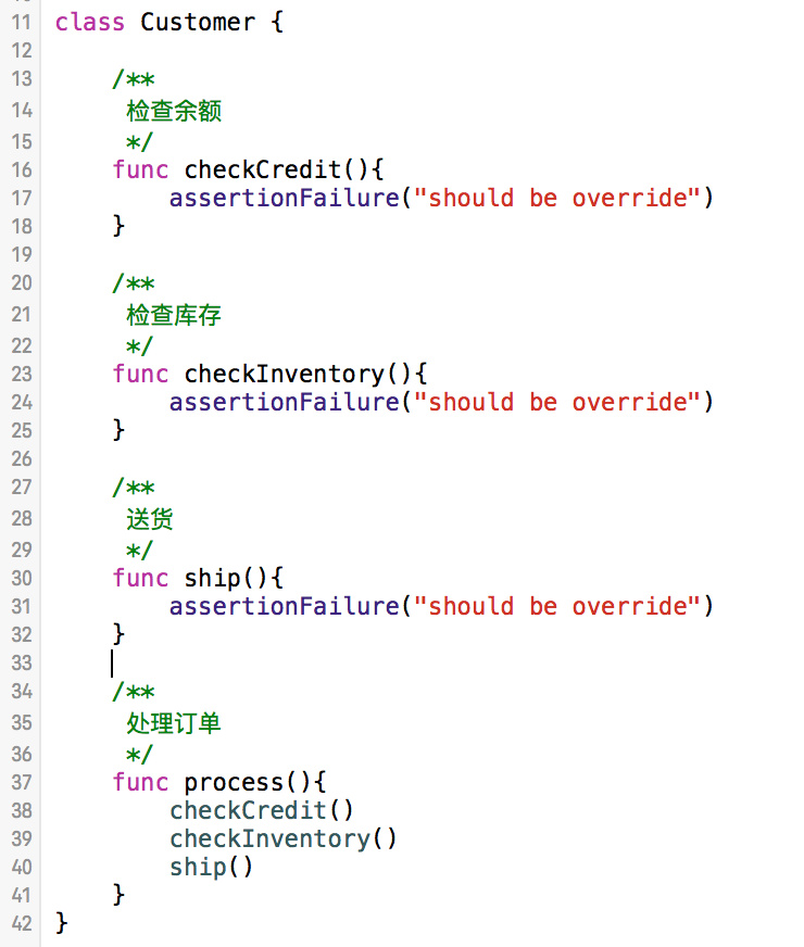 这个模式如果在其他语言中,基类应该是抽象类(abstract),这三个方法也应该是抽象方法。但是苦于swift中没有抽象这个关键字(我猜测是为了兼容OC),只能在方法中先写好断言。这样调用process方法时,如果子类没有重写时程序会中止提示。