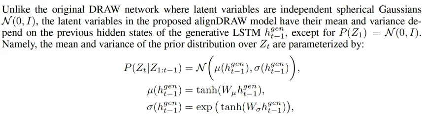 First, they extend the DRAW model to be conditional when generating, so that it adapts to a conditional generative model, namely alignDRAW. See the upper right part of Figure 2 in their paper, 。Such conditional extension is important for performance. As what they said,