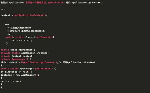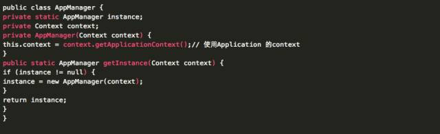 这是一个普通的单例模式,当创建这个单例的时候,由于需要传入一个Context,所以这个Context的生命周期的长短至关重要: