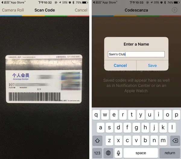 以 Sam 会员店为例,扫描卡片背面条形码,成功后为卡片添加一个名称便于识别。应用目前仅支持二维码或带有条形码的卡片,磁条卡不能支持。