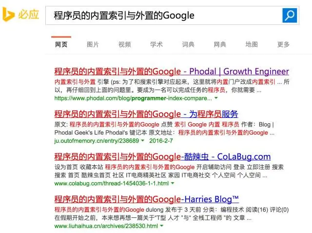 但是第二个网站仍然是聚合网站,What's the fuck。对于我来说,这已经是很好的结局,在Google中的第一个结果是自己的文章。对于必应来说也是一个不错是的结果,然而下面仍然是一堆的聚合网站: