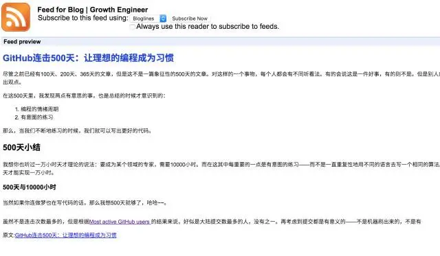 而对于RSS转载来说,一种很有效的策略就是限定字符的全文输出,并且在RSS的最后加一个原文链接。如下图所示: