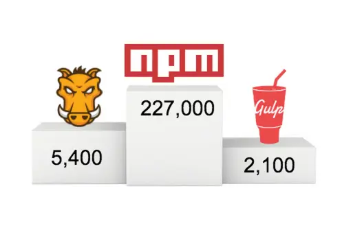 从上图可以看到,Gulp有将近2,100个插件;Grunt有将近5,400个;而npm则提供了227,000多个包,同时还以每天400多个的速度在持续增加。