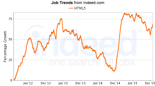 HTML5 可以说是最热门的前端岗位了,在 2010 年和 2014 年底有两次爆发性增长,现在在美国的岗位需求甚至超过了iOS。